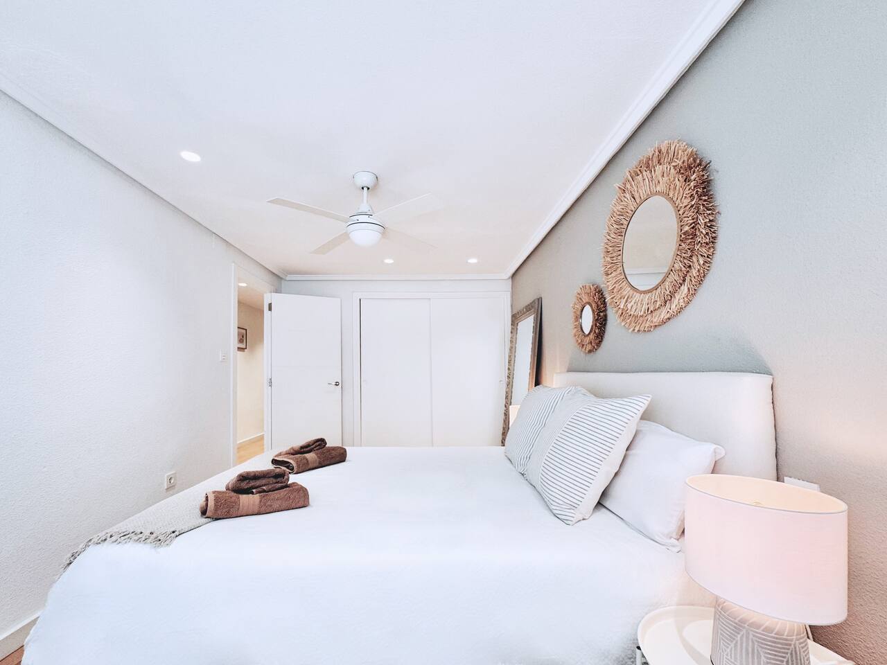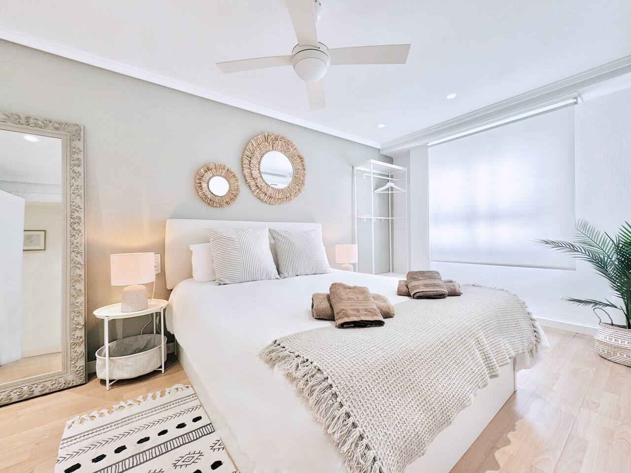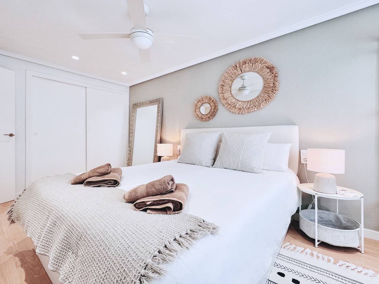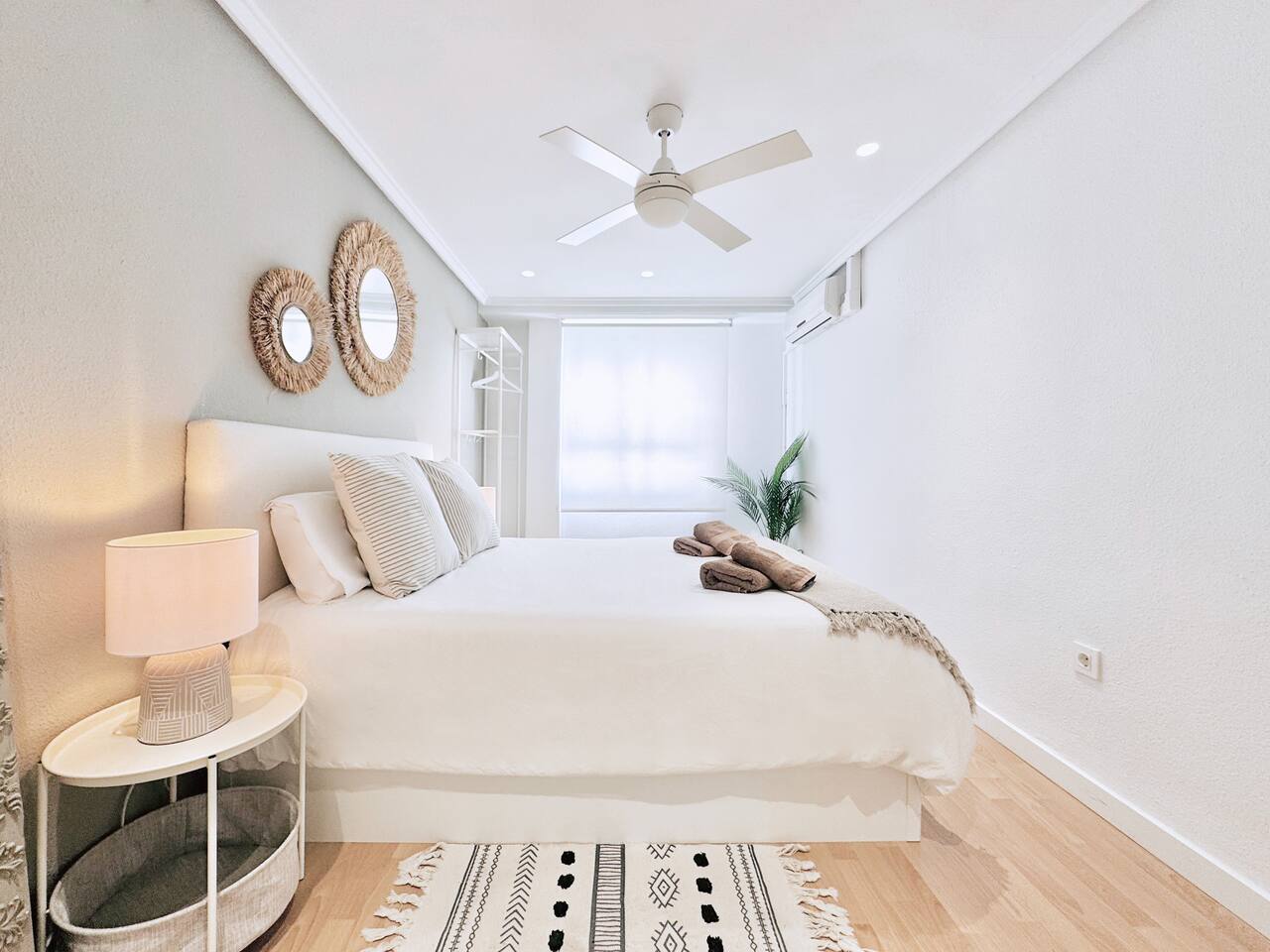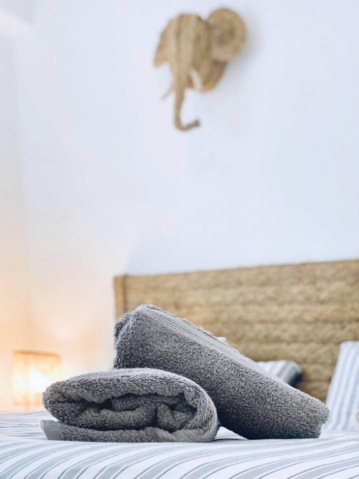 All the areas have split-like air conditioning and heating, plus ceiling fans in both rooms. Kitchen equipment includes dishwasher, fridge, filtered drinking water, oven, microwave, toaster and a Nespresso coffee maker. Wifi is available in all the space and there's a working desk for remote workers available in one of the rooms. Bed linen, towels and shower soap are provided for free. Extra cleaning can be delivered at a cost if you come for a long stay.