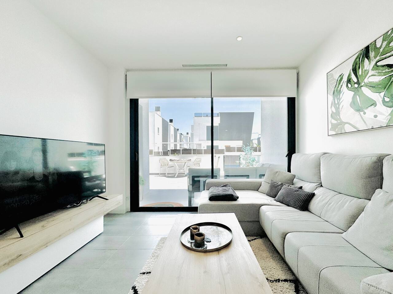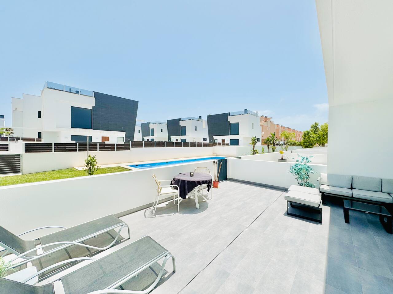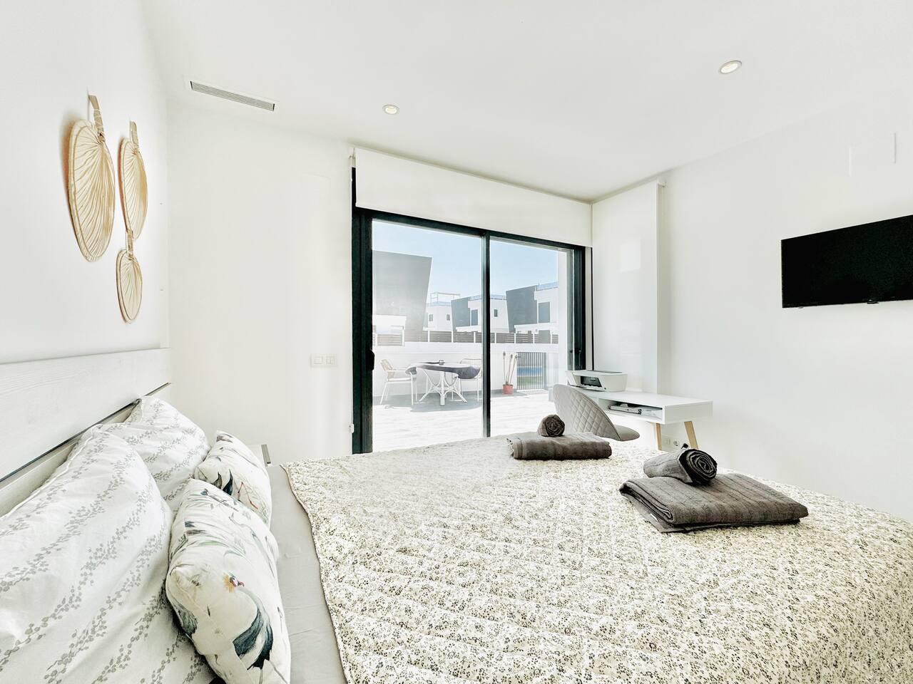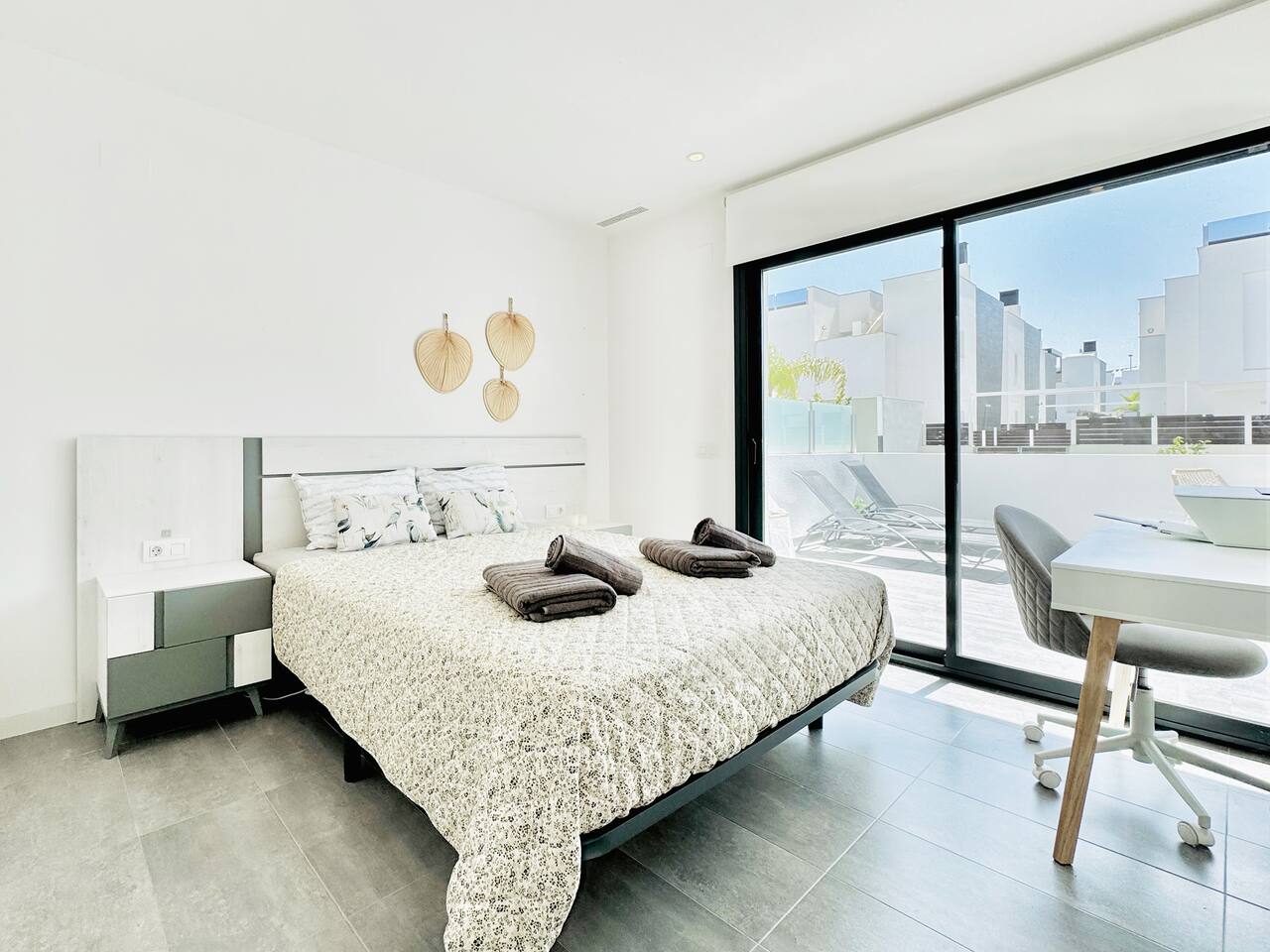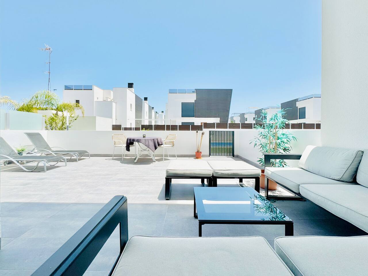 Enjoy beach life at this modern relaxing home, featuring an outdoor space with lounge sofa, and barbecue, facing the swimming pool, a spacious living room full of light, a fully equipped kitchen, 2double bedrooms, one with queen bed and one with 2 twin beds, and two bathrooms with shower.